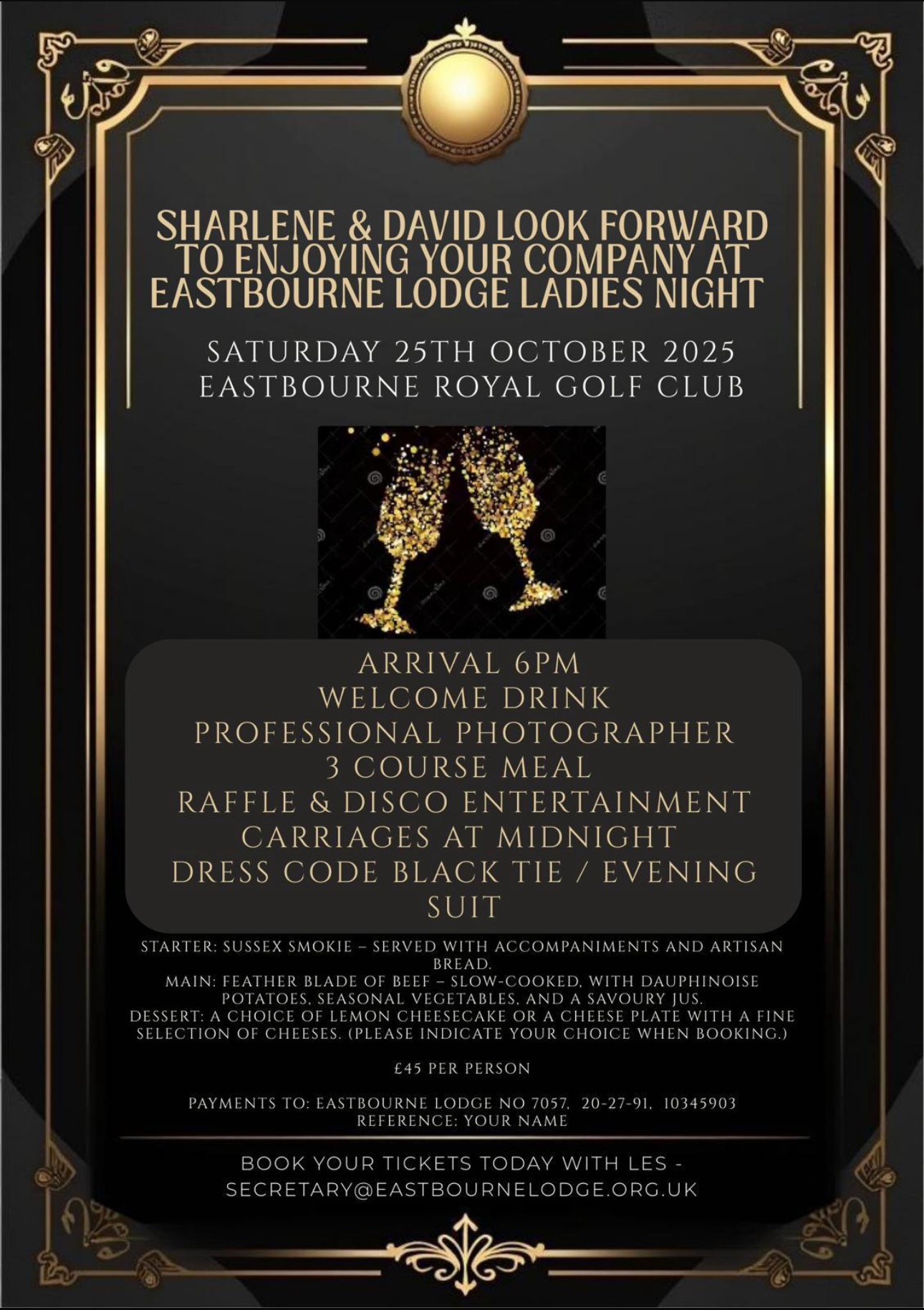 SHARLENE & DAVID LOOK FORWARD TO ENJOYING YOUR COMPANY AT EASTBOURNE LODGE LADIES NIGHT SATURDAY 25TH OCTOBER 2025