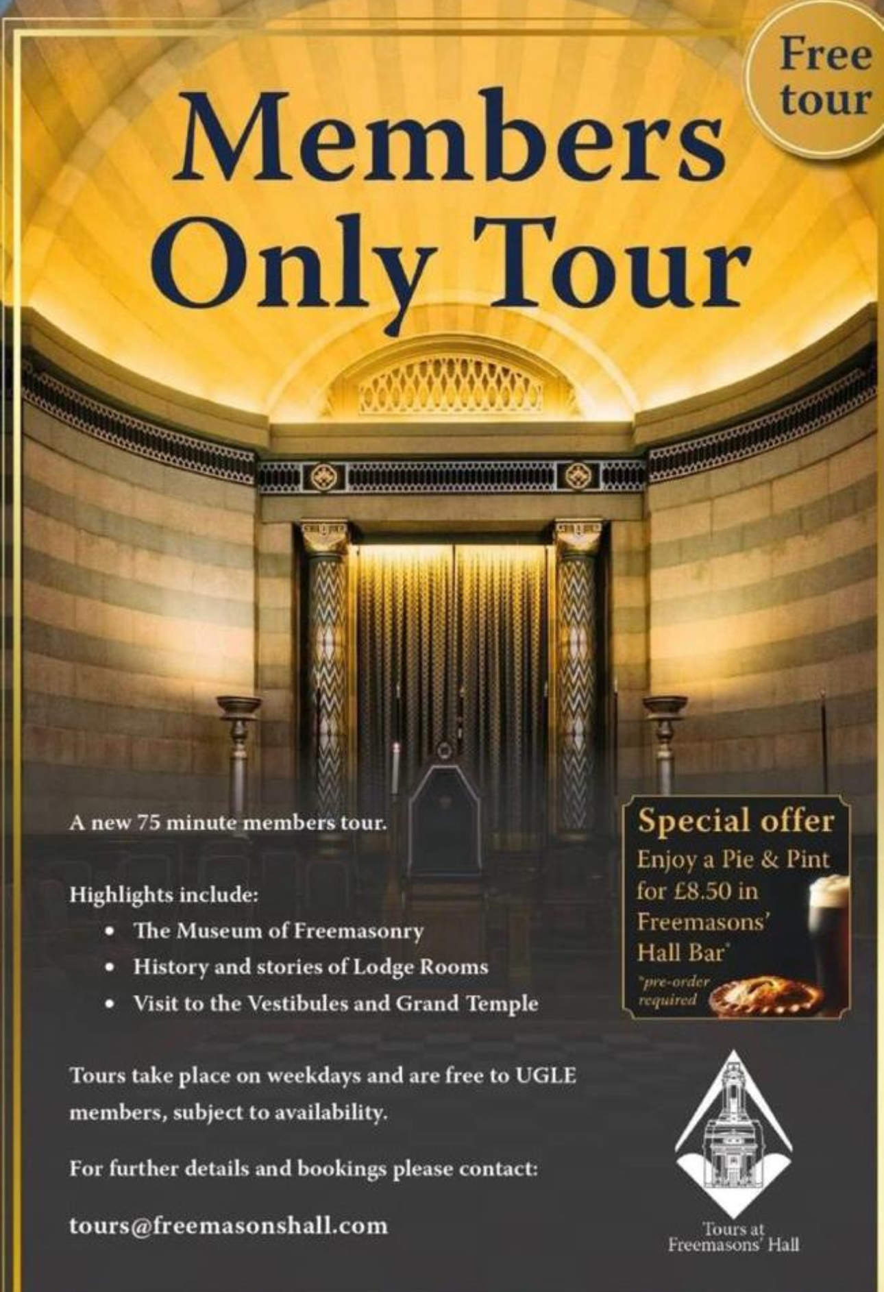 Tours take place on weekdays and are free to UGLE members, subject to availability.